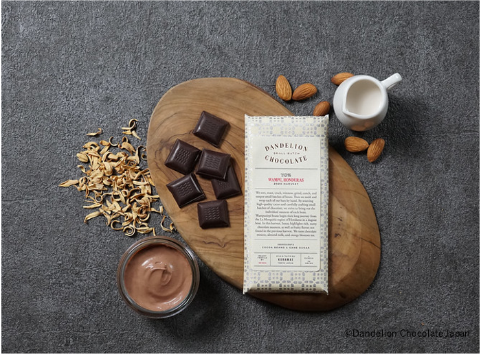 ダンデライオン・チョコレートでは、カカオ豆の選別からチョコレートになるまでの全ての工程をひとつのファクトリーで行う、「Bean to Bar」と呼ばれる製造方法で全てのチョコレートを作っています。1種類のカカオの産地からなる「シングルオリジン」(単一産地)が特徴で、原材料はカカオ豆とオーガニックのきび砂糖のみというシンプルさが特徴です。